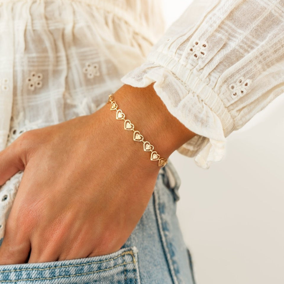The Lover Bracelet is a delicate chain of beautifully crafted hearts — each one symbolising affection, joy, and connection. Its radiant finish and graceful flow make it a charming piece that complements every outfit, from casual to elegant.