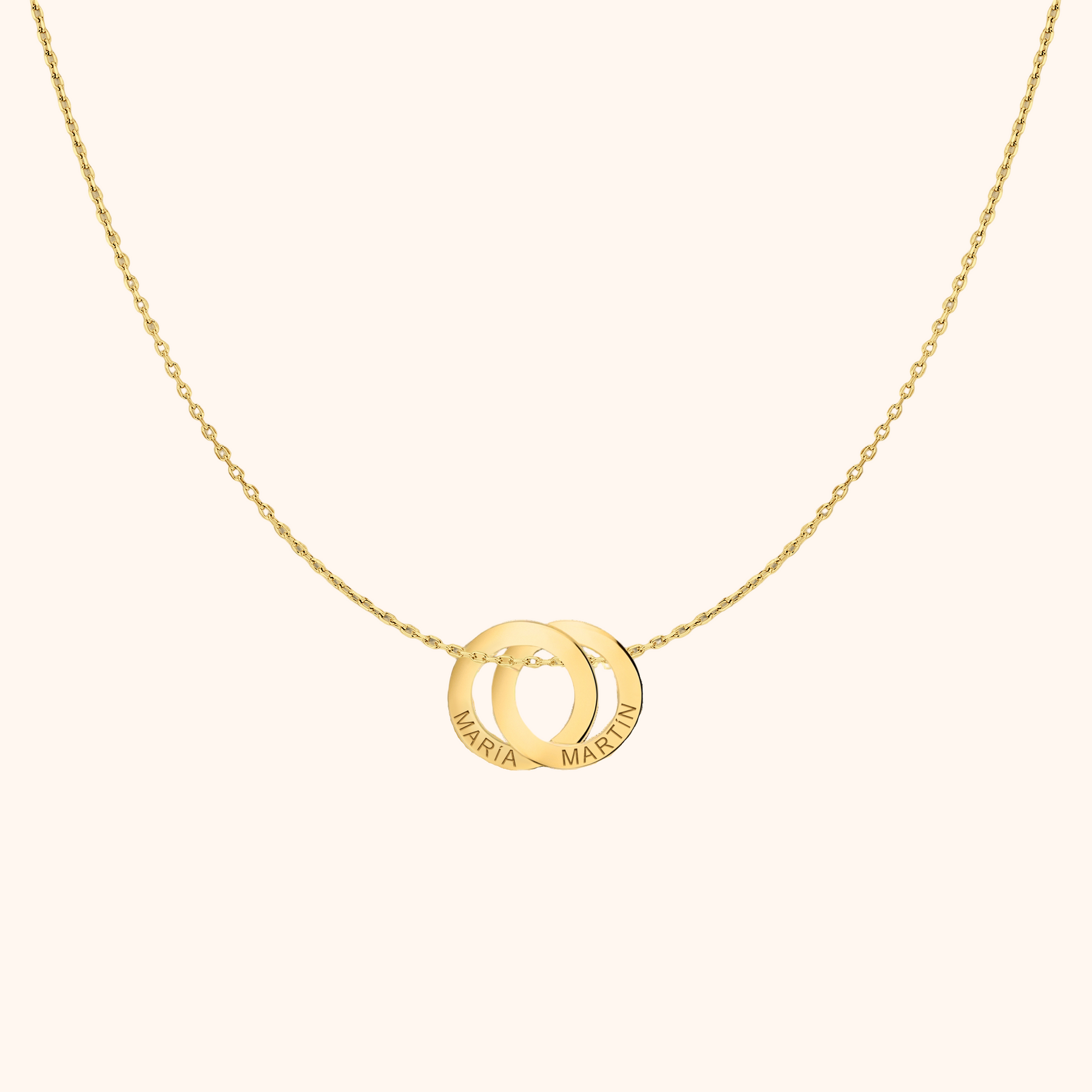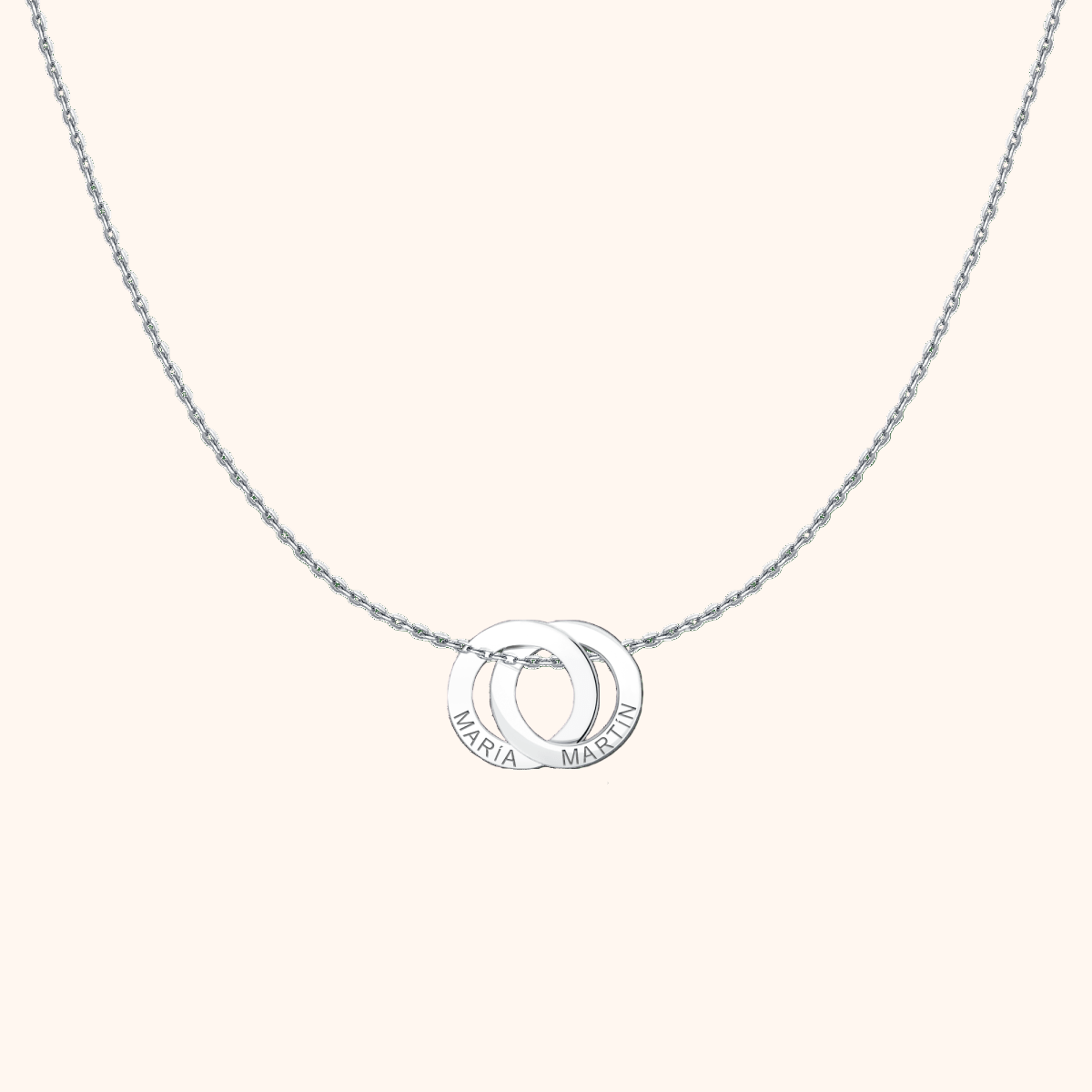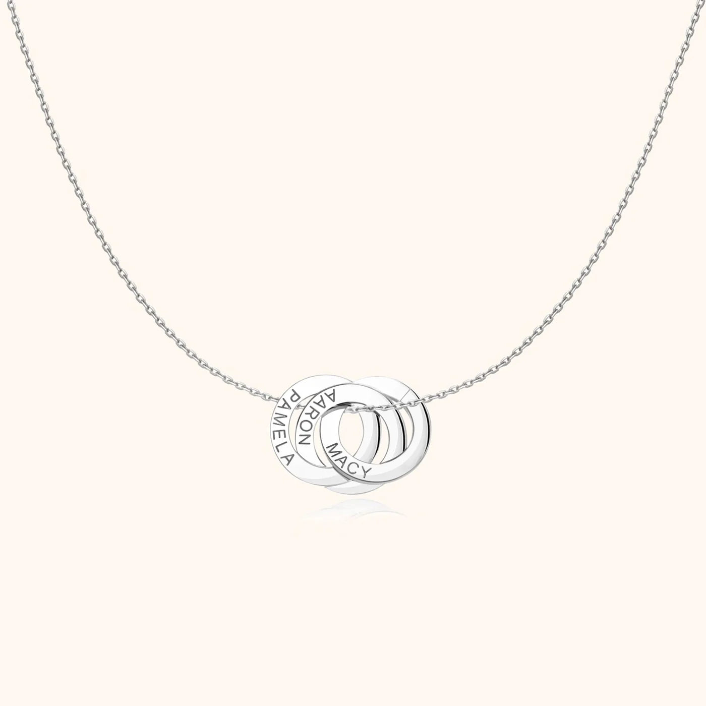 The Amity Necklace features interlocking rings you can engrave with up to 4 names or meaningful words. A timeless way to carry the people who matter most, always close to your heart.