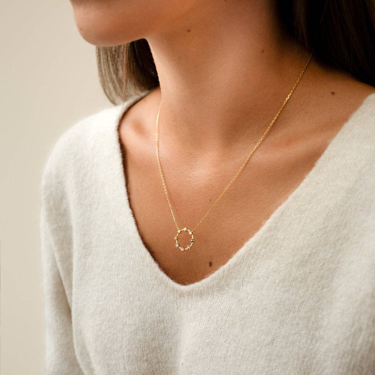 The Colour Circle Necklace features a stunning circular pendant adorned with multicolour zirconia stones — a symbol of energy, positivity, and individuality. Each gemstone adds a unique flash of light that brightens your look and your mood.