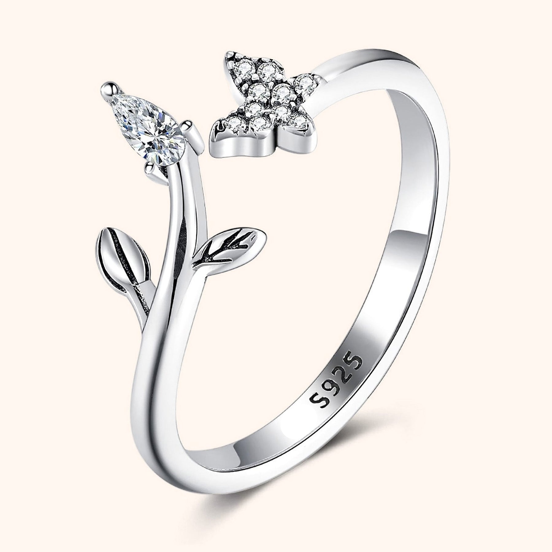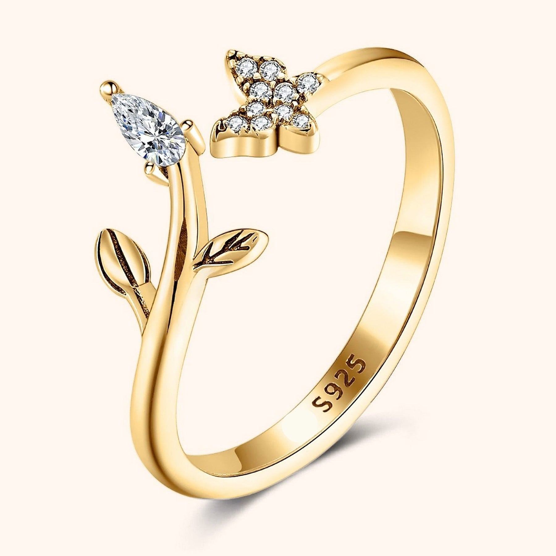 - Design: Open ring with butterfly and leaf details