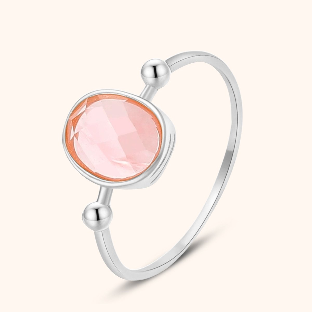 The Pink Glitter Ring features a stunning oval rose quartz at its center, framed by two delicate golden beads. A design that radiates femininity and soft elegance — perfect for adding a romantic glow to any look.