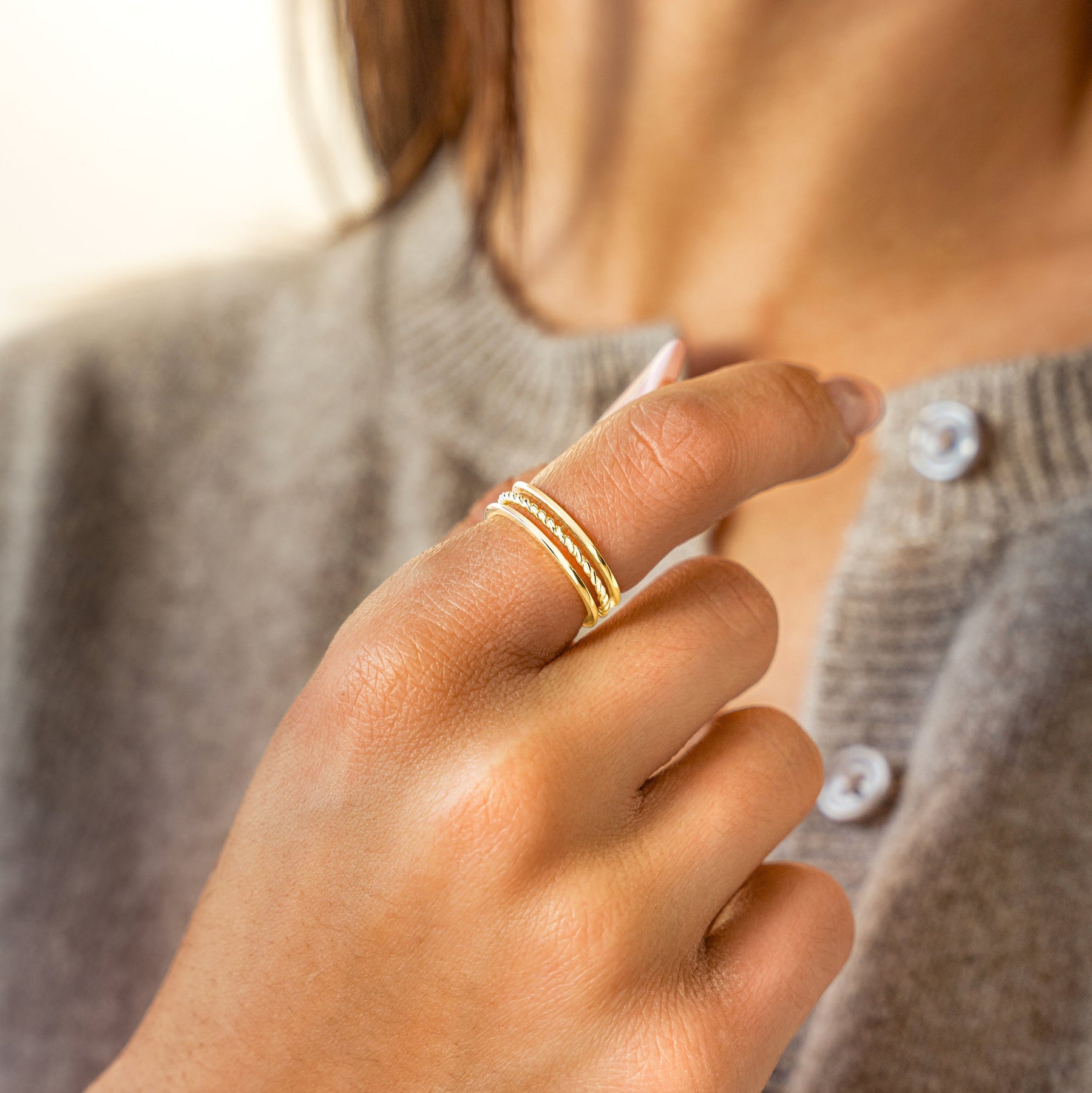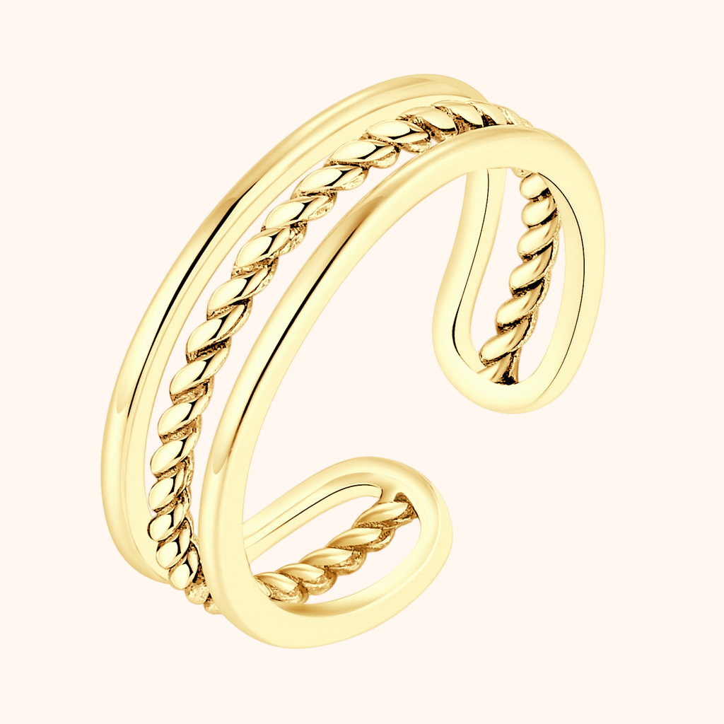 • Design: Double-band open ring with twisted detail