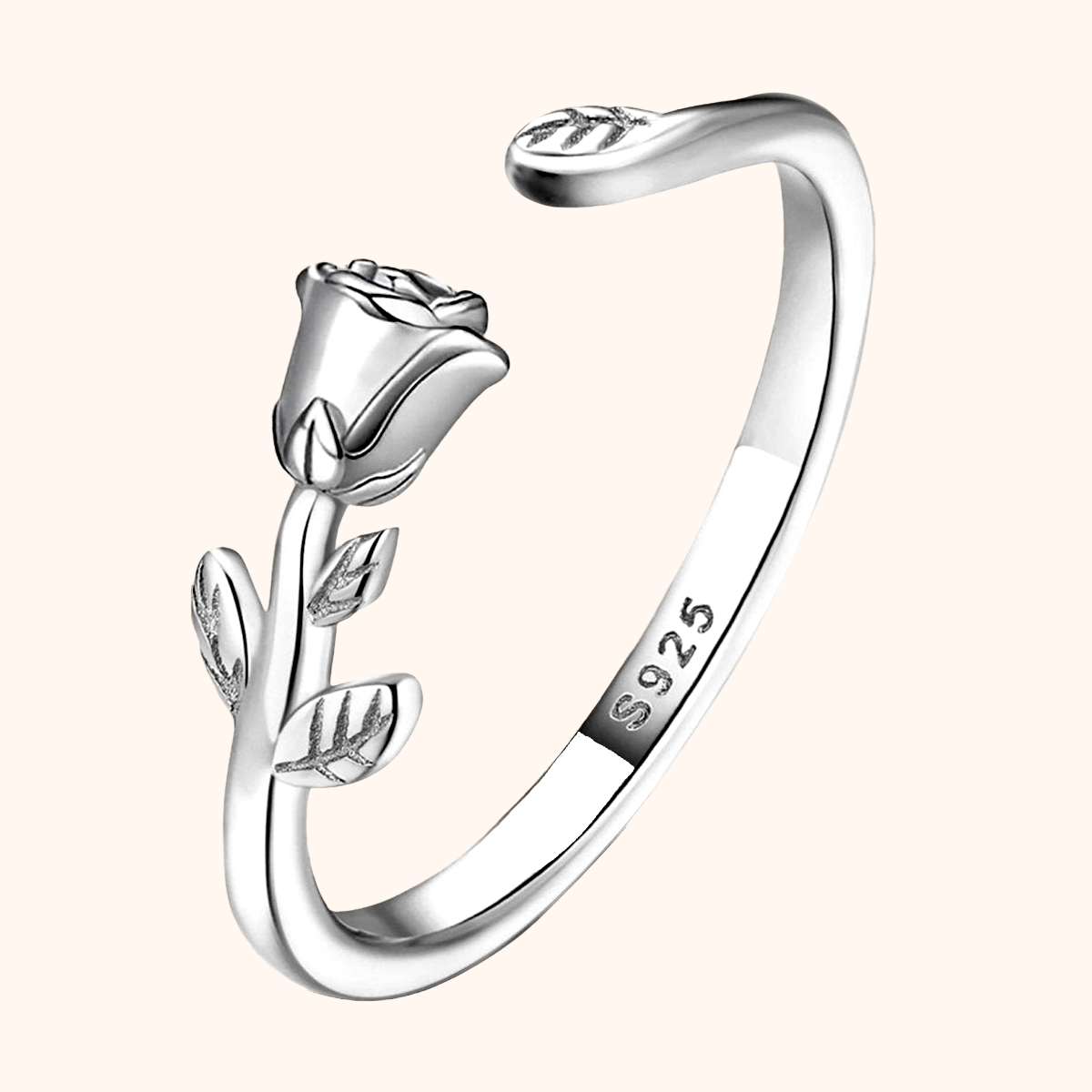 The Rose Bloom Ring features a delicate rose design with detailed leaves, capturing the essence of beauty and femininity. A piece that radiates elegance and can be worn on its own or stacked for a romantic touch.