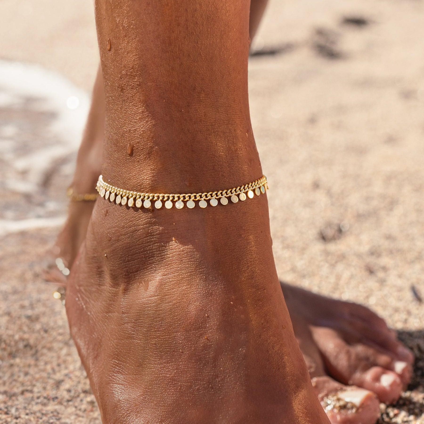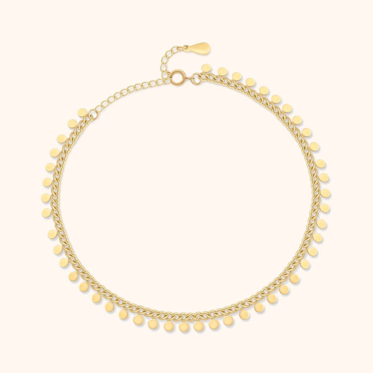 The Circle Charm Anklet features delicate flat circle pendants hanging along a fine chain — a minimalist design that adds effortless elegance to your look.