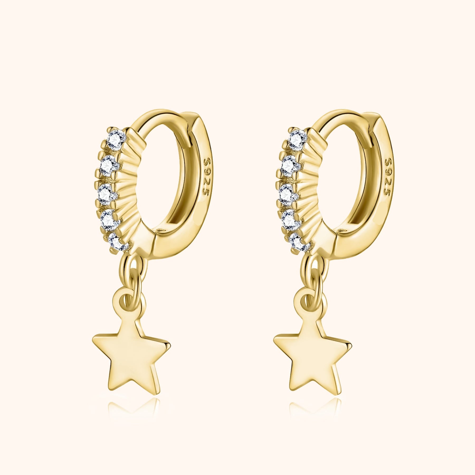 The Shooting Star Earrings feature delicate hoops adorned with sparkling white zirconia, finished with dangling star charms. A subtle yet striking design that brings light and elegance to any look.